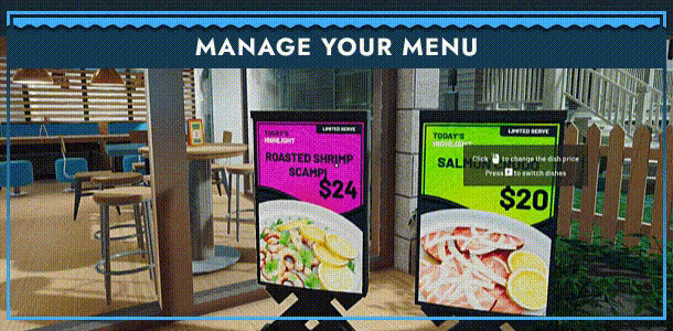 Customize your daily menu by selecting which dishes to serve. Balance customer preferences, ingredient availability, and profit margins to create the most appealing lineup.